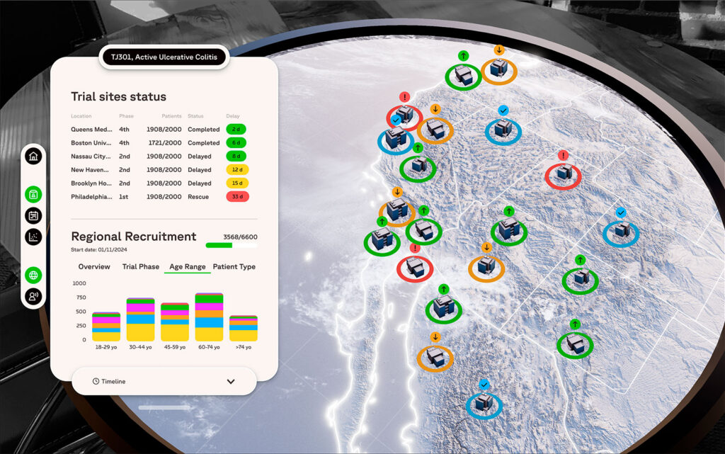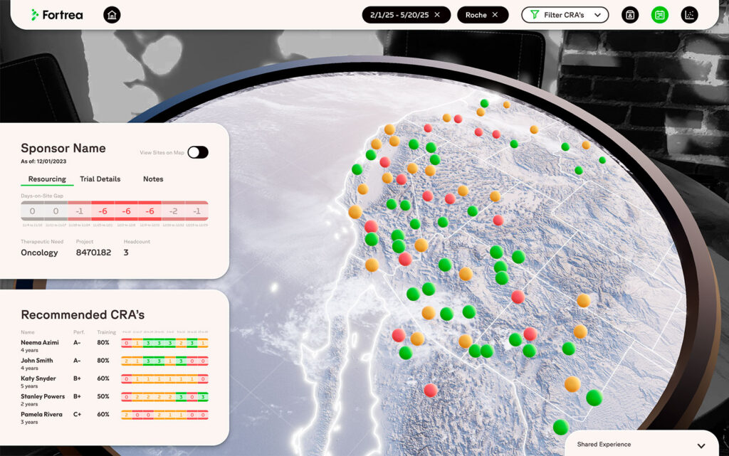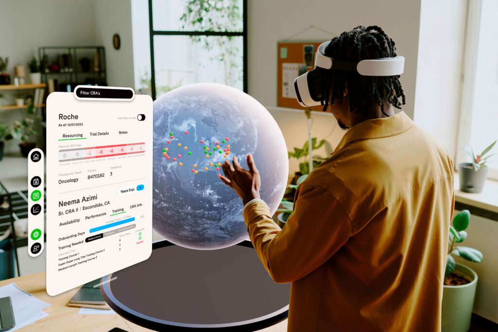 Fortrea is a company focused on clinical research. The challenge was to design a multi-device platform (AR, VR, and tablet) that would allow internal teams to visualize global data in real time, along with key business KPIs: resource availability, clinical trial status, staff allocation, and delay predictions.